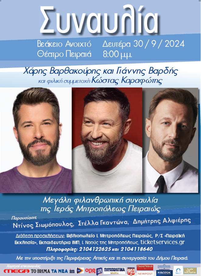 Ο Χάρης Βαρθακούρης και ο Γιάννης Βαρδής, με τη φιλική συμμετοχή του Κώστα Καραφώτη θα τραγουδήσουν στην Φιλανθρωπική Συναυλία που διοργανώνει, για μία ακόμη φορά, η Ι.Μητρόπολη Πειραιώς με την υποστήριξη της Περιφέρειας Αττικής και την συνεργασία του Δήμου Πειραιά, τη Δευτέρα 30 Σεπτεμβρίου 2024, στις 20:00, στο Βεάκειο Θέατρο Πειραιά.