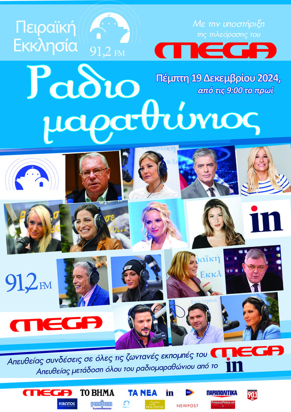 Ο Ραδιοφωνικός Σταθμός «Πειραϊκή Εκκλησία 91,2 fm», στηρίζει ΚΑΘΗΜΕΡΙΝΑ, μέσω ενός μεγάλου δικτύου εθελοντών, εμπράκτως την πολυπληθή κοινωνική ομάδα των απόρων και πονεμένων αδελφών μας. Για τον λόγο αυτό την Πέμπτη 19 Δεκεμβρίου από τις 08:30 διοργανώνει Ραδιομαραθώνιο κατά της φτώχειας με την υποστήριξη της τηλεόρασης του MEGA.